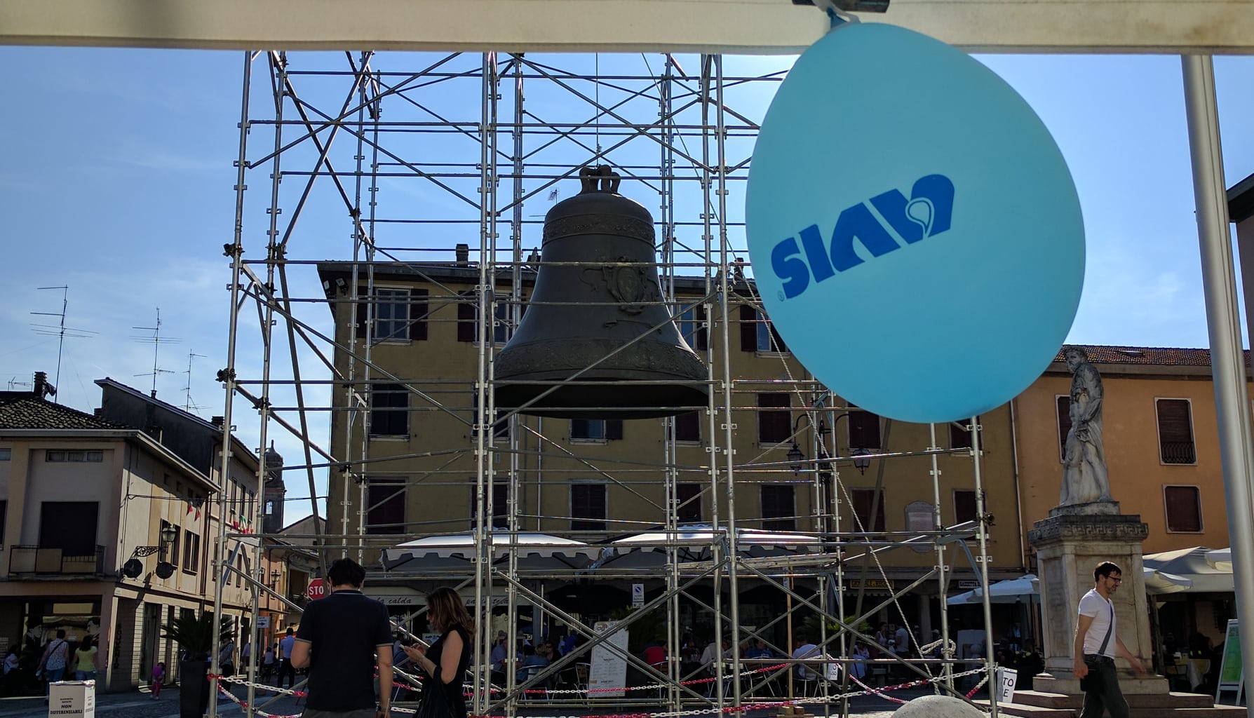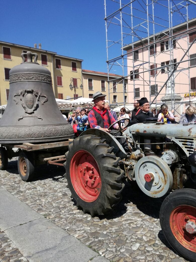 Intorno alle 16.30 la nota campana è stata sollevata su un’impalcatura e i due figuranti di Don Camillo e Peppone (Abdon Boni e Giulio Bersellini) hanno inscenato un curioso siparietto ricordando la scena del film “Don Camillo, monsignore ma non troppo”. In particolare Peppone si è posizionato sotto alla campana per osservare se vi fosse il batacchio (che nel film viene rubato) fino a venirne completamente coperto, suscitando gli applausi e le risate dei tantissimi presenti. Lo storico momento è stato rivissuto anche domenica 21 (fonte Gazzetta di Reggio).