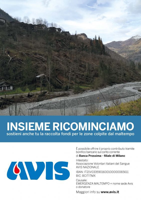 È possibile offrire il proprio contributo tramite bonifico bancario sul conto corrente di Banca Prossima – filiale di Milano intestato ad Associazione Volontari Italiani del Sangue – AVIS NAZIONALE, IBAN: IT21V0335901600100000065611, BIC: BCITITMX (Causale: ‘emergenza maltempo + nome sede o donatore ’).
