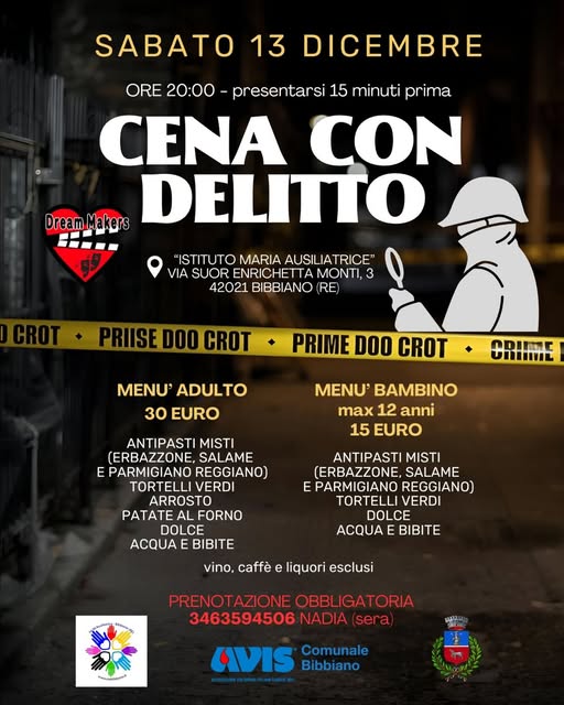 Una serata avvincente tra gusto e mistero, organizzata dagli amici di Avis Bibbiano, aspetta tutti gli appassionati di intrighi sabato 13 dicembre presso l’Istituto Maria Ausiliatrice, in via Suor Enrichetta Monti 3, a Bibbiano (RE).