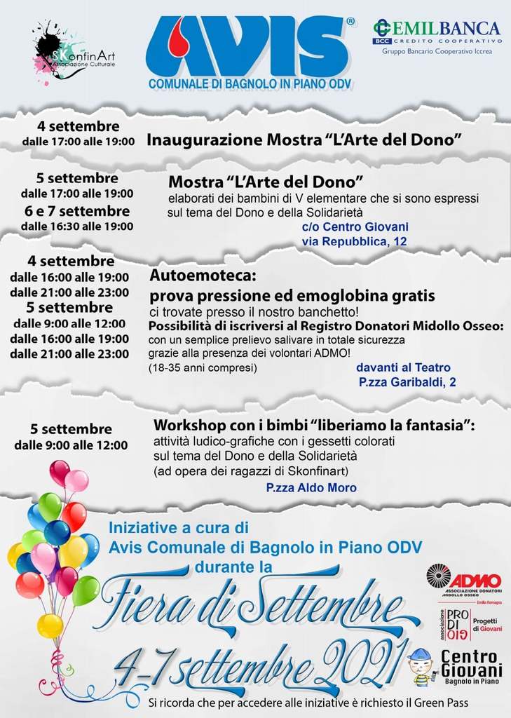 Vi presentiamo il programma che l’Avis comunale di Bagnolo ha pensato per questi giorni di fiera: