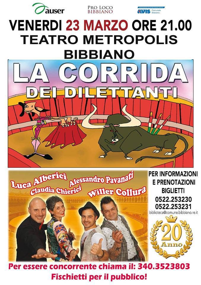Venerdì 23 marzo, presso il Cinema Teatro Metropolis di Via Gramsci 4, Avis Bibbiano presenta la “Corrida dei Dilettanti” è uno spettacolo unico dove protagonista è il pubblico che, dotato di fischietti e campanacci, deve giudicare i concorrenti.