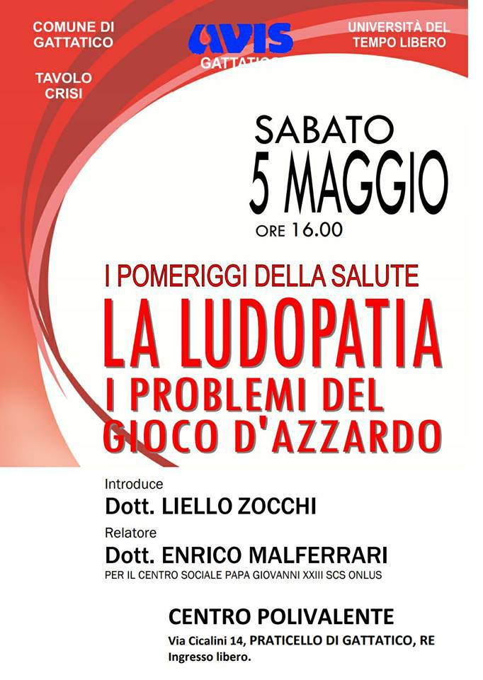 L’Avis locale, insieme al Comune e all’Università del Tempo Libero, vi aspettano sabato 5 maggio alle ore 16.00, al Centro Polivalente di Praticello di Gattatico (via Cicalini 14) per parlare di ludopatia.